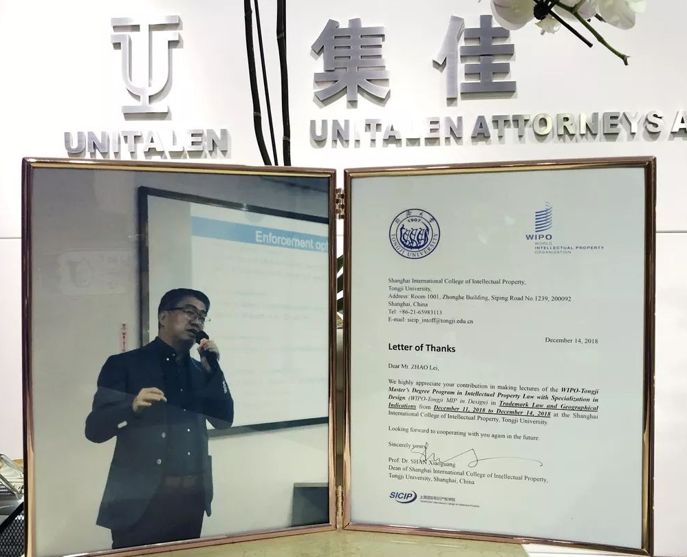 Unitalen partner Ray Zhao was invited to give lectures to the 2018 freshmen of the “WIPO - Tongji University Joint Training in IP Law (Design) Master Program”. This is the second consecutive year that Mr. Zhao lectured as a part-time professor for the master's program at the college.