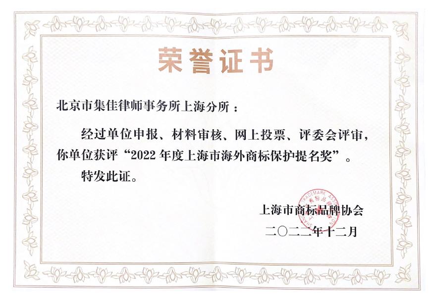 集佳上海分所榮獲年度優(yōu)秀商標代理案例和海外商標保護提名獎等表彰,助推商標代理機構達標工作