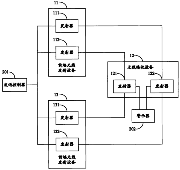本實(shí)用新型實(shí)施例公開了無線安防報(bào)警系統(tǒng)和裝置。其中,無線安防報(bào)警系統(tǒng)包括前端無線發(fā)射設(shè)備和無線接收設(shè)備,前端無線發(fā)射設(shè)備包括多個(gè)在發(fā)生警情時(shí)發(fā)送報(bào)警信號(hào)的發(fā)射器,任一發(fā)射器所發(fā)送報(bào)警信號(hào)的頻率與其他發(fā)射器所發(fā)送報(bào)警信號(hào)的頻率處于不同頻段;無線接收設(shè)備包括與多個(gè)發(fā)射器一一對(duì)應(yīng)的多個(gè)接收器??梢姡緦?shí)用新型實(shí)施例中任一發(fā)射器-接收器所工作的頻段與其他發(fā)射器-接收器所工作的頻段均不相同。當(dāng)工作于某個(gè)頻段的接收器遭受同頻干擾或鄰頻干擾時(shí),其他頻段的接收器還可與對(duì)應(yīng)的發(fā)射器保持正常通訊,從而解決了現(xiàn)有的、只使用單一頻段的無線安防報(bào)警系統(tǒng)因受到同頻干擾或鄰頻干擾而導(dǎo)致的漏報(bào)警問題。 |