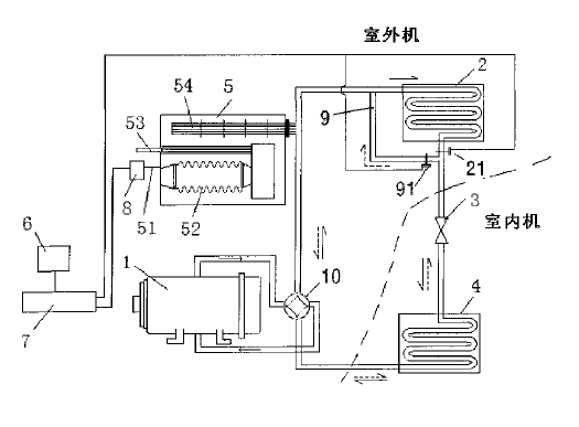 本發(fā)明公開了一種制冷、制熱的雙能源燃?xì)鉄岜每照{(diào)系統(tǒng)及運(yùn)行方法,包括熱泵系統(tǒng),還包括一真空鍋爐換熱裝置、一溫度傳感器、以及一切換電路;真空鍋爐換熱裝置設(shè)置在室外,通過管道連接在熱泵系統(tǒng)的壓縮機(jī)和第一熱交換器之間,與其他部件處于同一循環(huán)系統(tǒng)中;溫度傳感器設(shè)置在室外,該溫度傳感器的輸出端與切換電路的輸入端電連接;切換電路根據(jù)溫度傳感器輸出的溫度信號(hào)控制真空鍋爐換熱裝置和第一熱交換器的交替啟閉。當(dāng)室外溫度降到設(shè)定溫度以下時(shí),真空鍋爐裝置制熱,從而徹底解決了普通熱泵系統(tǒng)在冬天低氣溫的時(shí)候室外機(jī)從空氣中吸熱效率低下、以及結(jié)霜導(dǎo)致系統(tǒng)無法運(yùn)行的問題。具有效率高、制熱效果好和降低用電高峰時(shí)電力系統(tǒng)的壓力的優(yōu)點(diǎn)。 |