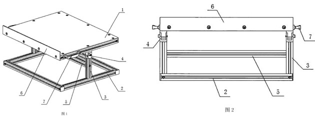 本發(fā)明公開了一種用于木工電刨上的門、窗檔條斜肩加工臺(tái)。座體1是一個(gè)上下底面為等腰直角三角形的三棱柱;座體1其中的一直角邊形成的柱體側(cè)面的兩端端頭分別帶一座夾5,并從此柱體側(cè)面開始做一延至斜邊形成的柱體側(cè)面上的鋸槽4;座體1斜邊形成的柱體側(cè)面兩端端頭分別放置一支座3,在兩支座3上放置一靠塊2、且三者之間形成“I”形。采用此裝置可以提高工作效率和加工件的標(biāo)準(zhǔn)程度,且此裝置結(jié)構(gòu)簡(jiǎn)單,成本低廉,使用安全方便。 |