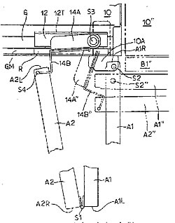 | 25 | 實(shí)用新型 | 門的開關(guān)機(jī)構(gòu) | 本發(fā)明提供可以把折疊式門打開大于90度角的門的開關(guān)機(jī)構(gòu)。柜體(10)形成的開門部位至少有要開關(guān)一部分的相鄰的兩扇門A1、A2,以上下方向的第1軸S1為中心連結(jié)在一起,并可以相互轉(zhuǎn)動(dòng),一扇門A1具有以遠(yuǎn)離上述第1軸一側(cè)A1R附近上下方向的第2軸S2為中心與柜體連結(jié),并能相對(duì)柜體轉(zhuǎn)動(dòng)的折疊式門A,以及沿柜體開口部位左右方向移動(dòng)的移動(dòng)件12,以上下方向的第3軸S3為中心與上述移動(dòng)件連結(jié),并能相對(duì)上述移動(dòng)件轉(zhuǎn)動(dòng)的轉(zhuǎn)動(dòng)部件14A、14B。上述折疊式門的另一扇門A2以在遠(yuǎn)離上述第1軸一側(cè)A2L附近的第4軸S4為中心,連結(jié)上述轉(zhuǎn)動(dòng)部件,并可以相互轉(zhuǎn)動(dòng)。 |