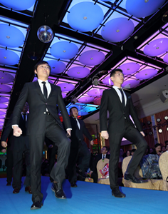 顧問部男士整齊列隊(duì),踏著Mc Jacson的超強(qiáng)動(dòng)感節(jié)奏閃亮出場,向舞臺(tái)致敬,并伴著杜鵑圓舞曲的響起,與舞臺(tái)上的女士優(yōu)雅起舞。不足兩分鐘的表演,仿佛讓我們置身于西方宏大典雅的皇家禮堂,也為集佳星光大道帶來最精彩震撼的開場。
