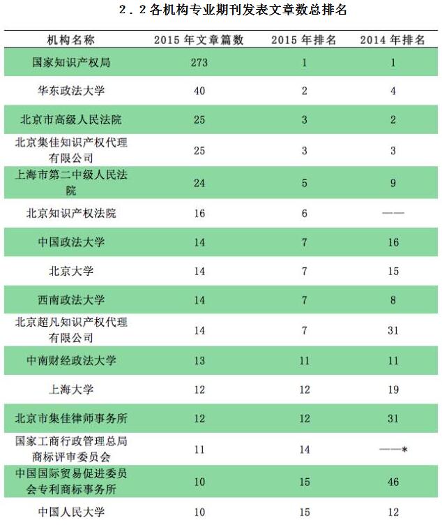 日前,上海知識(shí)產(chǎn)權(quán)研究所對(duì)2015年度我國(guó)知識(shí)產(chǎn)權(quán)專業(yè)文章發(fā)表情況進(jìn)行了統(tǒng)計(jì)分析,在包括科研院所、司法系統(tǒng)、政府部門、社會(huì)組織等各機(jī)構(gòu)文章發(fā)表總量排名中,集佳緊隨國(guó)家知識(shí)產(chǎn)權(quán)局、華東政法大學(xué)、北京市高級(jí)人民法院,以全年發(fā)表量25篇的成績(jī),領(lǐng)跑社會(huì)組織類機(jī)構(gòu)。此外,北京市集佳律師事務(wù)所以全年發(fā)表12篇的成績(jī)?cè)谏鐣?huì)組織類機(jī)構(gòu)排名中名列第三。