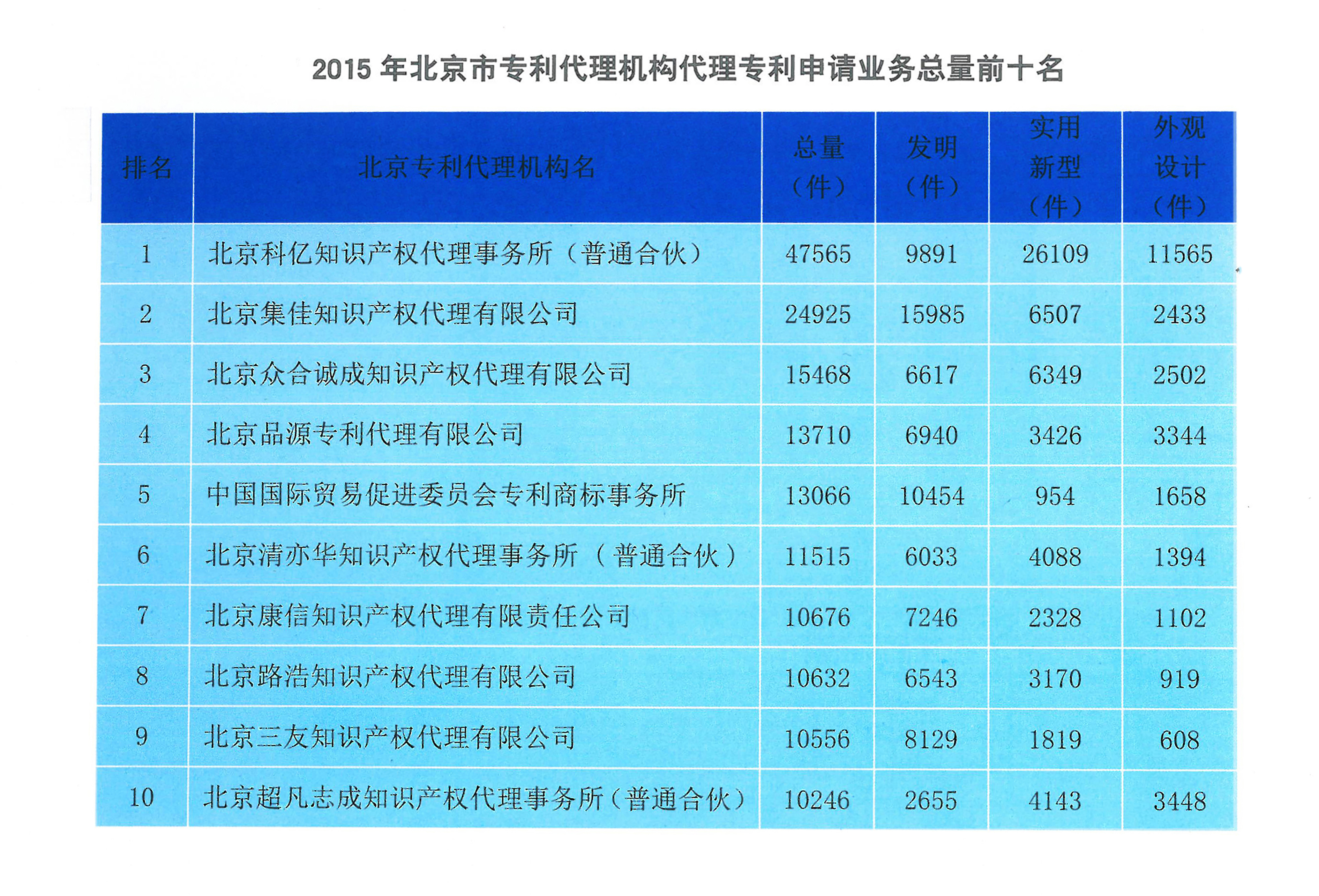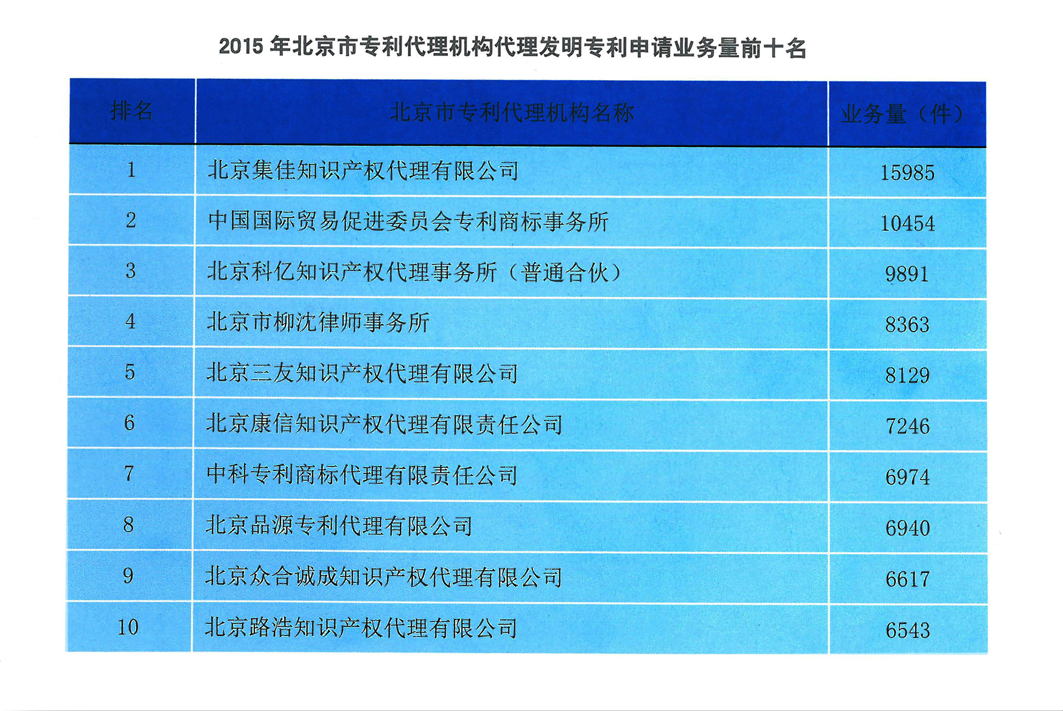自《北京市專利代理年報》發(fā)布以來,集佳每年都在不同業(yè)務(wù)領(lǐng)域和不同指標(biāo)排名中名列前茅,尤其在發(fā)明專利申請量、有效專利申請量、專利申請業(yè)務(wù)總量等公認(rèn)值得參考的評價項(xiàng)目上。而這些指標(biāo)通常是代理機(jī)構(gòu)專業(yè)水平、代理質(zhì)量、市場開拓、服務(wù)質(zhì)量等綜合能力的反映。