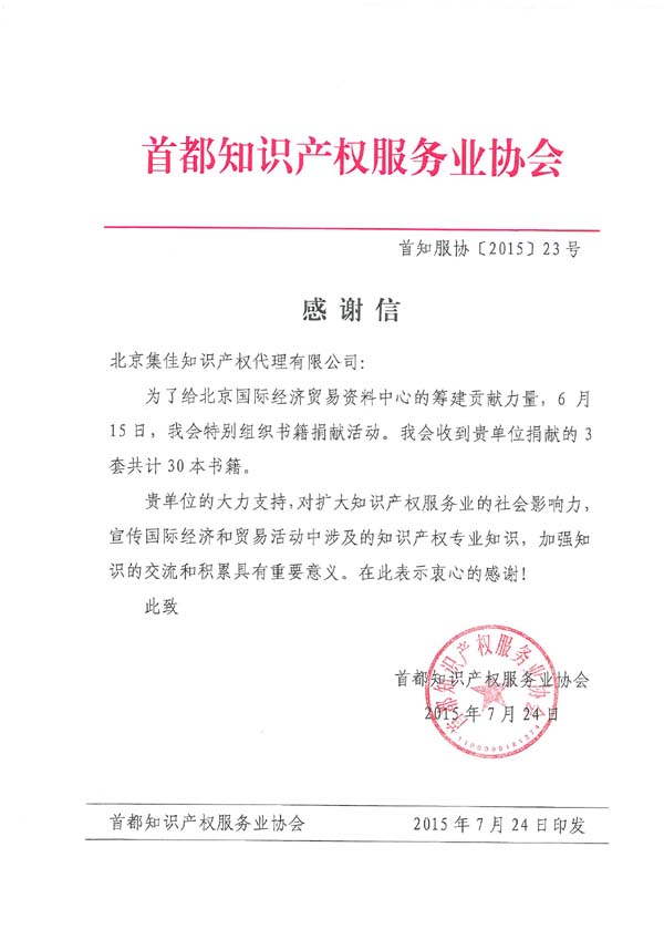 2015年7月24日,首都知識產(chǎn)權(quán)服務(wù)業(yè)協(xié)會向集佳發(fā)來感謝信。在其六月份組織的書籍捐獻活動中,集佳捐贈30本出自集佳專業(yè)人士的系列叢書《知識產(chǎn)權(quán)戰(zhàn)略與實務(wù)》,為北京國際經(jīng)濟貿(mào)易資料中心的籌建貢獻一份力量。