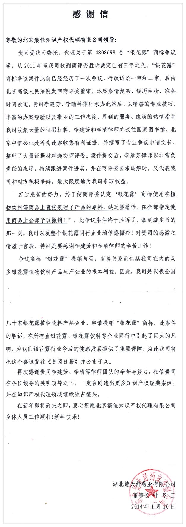 在新年即將到來之際,湖北楚天舒藥業(yè)有限公司給集佳發(fā)來感謝信,并提前祝福集佳全體人員新年快樂,工作順利。 集佳律師曾代理該公司第4808698 號"銀花露"商標爭議案獲得全面勝利。該案案情復雜、經歷曲折、準備時間緊迫,該案的勝訴,在所有金銀花露、銀花露飲料等企業(yè)同行中引起了巨大的凡響,為銀花露行業(yè)今后的健康發(fā)展提供了重要保障。