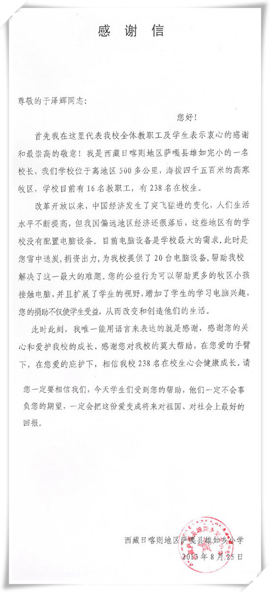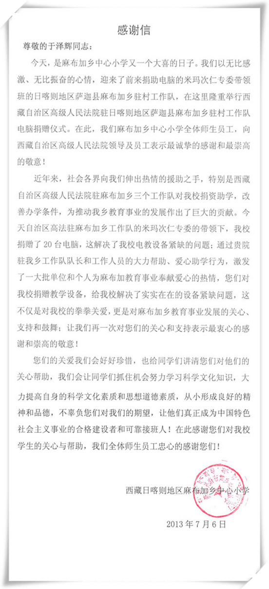 2013年春節(jié)前后,集佳先后精心準(zhǔn)備了多批電腦,為藏區(qū)的孩子們送去了一份份溫暖的春節(jié)禮物。近日,集佳陸續(xù)收到薩迦縣麻布加鄉(xiāng)小學(xué)和日喀則地區(qū)薩嘎縣雄如鄉(xiāng)小學(xué)的感謝信,感謝集佳捐贈(zèng)電腦,為學(xué)校解決了難題,也為孩子們了解大千世界開(kāi)啟了一扇門(mén)!