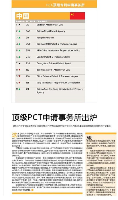 近日,全球知名知識(shí)產(chǎn)權(quán)雜志Managing Intellectual Property(MIP)公布了中國(guó)事務(wù)所的PCT(專利合作條約)申請(qǐng)排名,在申請(qǐng)日(優(yōu)先權(quán)日)介于2007年7月1日至2008年6月30日之間、30個(gè)月的絕限落在2010年1月至2010年12月間的已公開的PCT申請(qǐng)中,集佳知識(shí)產(chǎn)權(quán)代理有限公司以717件申請(qǐng)?jiān)谥袊?guó)代理機(jī)構(gòu)排名中位列第一。