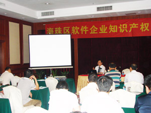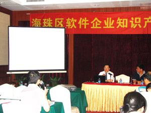 一直以來,區(qū)內(nèi)大部分軟件企業(yè)的軟件產(chǎn)品都是以登記著作權(quán)進(jìn)行保護(hù),為了指導(dǎo)企業(yè)運(yùn)用專利權(quán)保護(hù)軟件的核心內(nèi)容,有效維護(hù)軟件企業(yè)的權(quán)益,海珠區(qū)知識(shí)產(chǎn)權(quán)局特舉辦了本次活動(dòng)。廣州市知識(shí)產(chǎn)權(quán)局吳岳靜局長、楊抗帝巡視員,海珠區(qū)政協(xié)副主席、知識(shí)產(chǎn)權(quán)局劉金鵬局長,廣州市軟件協(xié)會(huì)姚柳森副秘書長以及區(qū)知識(shí)產(chǎn)權(quán)局相關(guān)人員,轄區(qū)內(nèi)近20家軟件企業(yè)和相關(guān)科技園區(qū)的負(fù)責(zé)人出席參加了本次活動(dòng)。