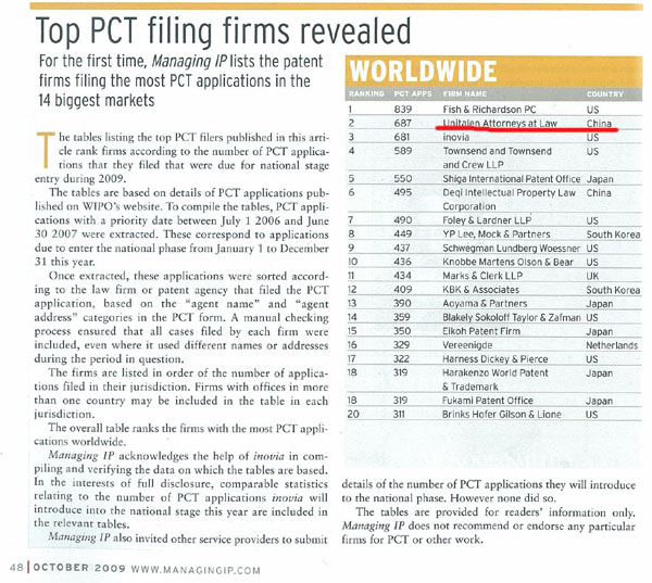 近日,根據(jù)全球權(quán)威知識產(chǎn)權(quán)刊物Managing Intellectual Property (MIP)2009年10月期公布的一份數(shù)據(jù)顯示,全球PCT申請統(tǒng)計中,在申請日(優(yōu)先權(quán)日)介于2006年7月1日至2007年6月30日之間,30個月的絕限落在2009年1月至2009年12月間的已經(jīng)公開的PCT申請中,集佳知識產(chǎn)權(quán)代理有限公司以687件申請在全球代理機構(gòu)排名中僅次于一家美國事務(wù)所而位列第二,也是中國唯一一家躋身全球前五名的知識產(chǎn)權(quán)服務(wù)機構(gòu)。