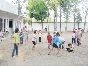 陸廟村集佳希望小學(xué)的孩子們?cè)谛滦I崂飳W(xué)習(xí) 彪池村集佳希望小學(xué)的孩子們?cè)诓賵?chǎng)上玩耍