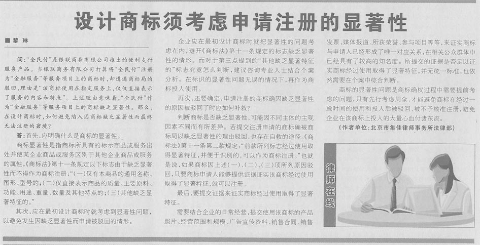 集佳代理人撰文《設(shè)計(jì)商標(biāo)須考慮申請(qǐng)注冊(cè)的顯著性》在《中國(guó)貿(mào)易報(bào)》發(fā)表