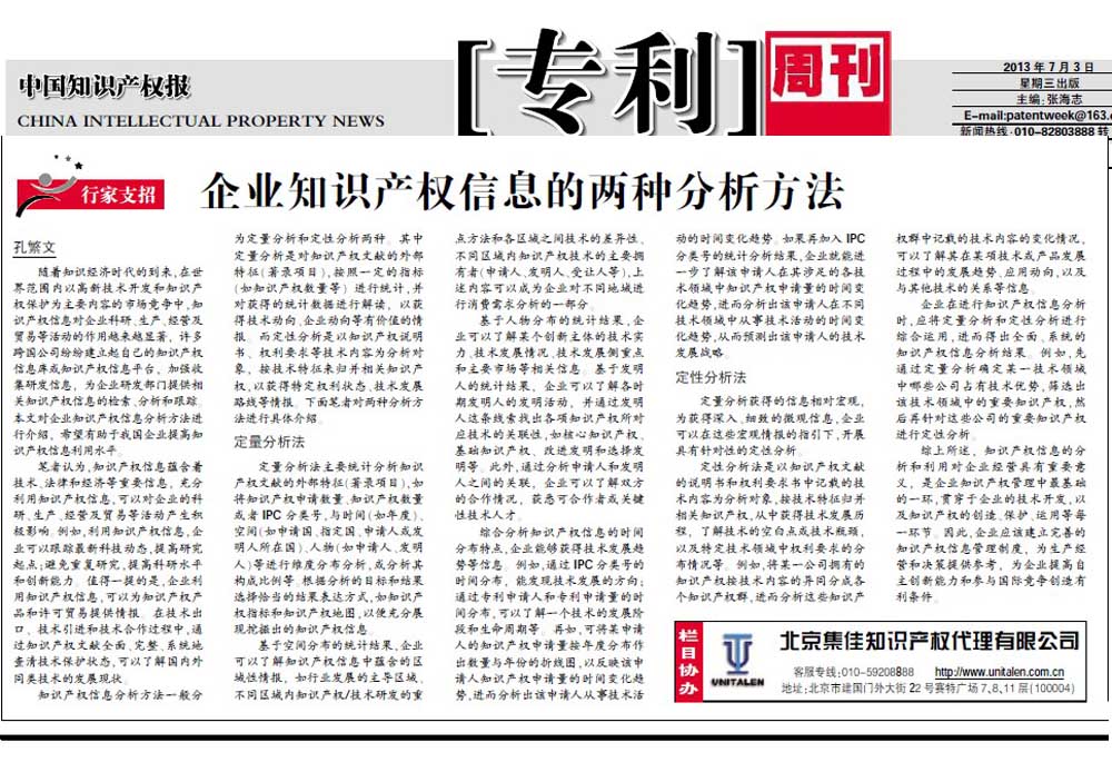 《中國(guó)知識(shí)產(chǎn)權(quán)報(bào)》:企業(yè)知識(shí)產(chǎn)權(quán)信息的兩種分析方法