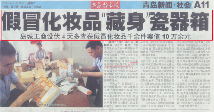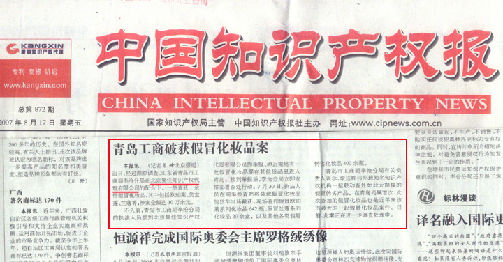 《半島都市報(bào)》、《中國(guó)知識(shí)產(chǎn)權(quán)報(bào)》:集佳聯(lián)合青島市李滄工商分局破獲大規(guī)模假冒化妝品案