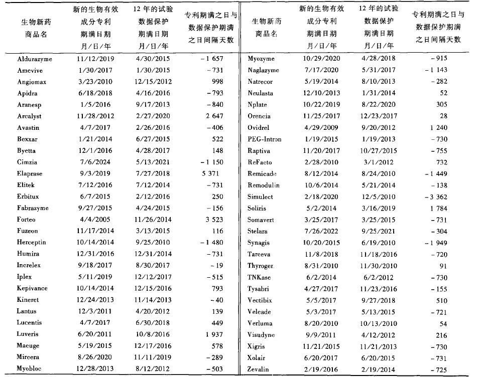 藥品數(shù)據(jù)保護(hù)制度,尤其是藥品數(shù)據(jù)獨占權(quán)模式的藥品數(shù)據(jù)保護(hù)制度,能夠顯著地彌補專利及其他保護(hù)形式的不足,推遲仿制藥的上市,為原研藥繼續(xù)保持合法的市場壟斷地位。眾所周知,專利保護(hù)對于原研藥而言是絕對的生命線,但是隨著研發(fā)新藥的難度和投資成本越來越大,研發(fā)周期越來越長,始終保持不變的20年專利保護(hù)期(對于大多數(shù)國家而言)就越來越起到推動原研藥廠商開發(fā)新藥的作用,數(shù)據(jù)保護(hù)制度的出現(xiàn)在一定程度上解決了這一矛盾。有研究人員對2010年3月美國《生物技術(shù)制品價格競爭與創(chuàng)新法》(Biologics Price Competition and Innovation Act,BPCIA)頒布后能夠享受數(shù)據(jù)保護(hù)的56個生物新藥進(jìn)行了研究,其中有接近一半的藥物在專利過期后仍然能享受數(shù)據(jù)保護(hù)所賦予的市場壟斷地位(見下表),其中最長的接近十年7。
