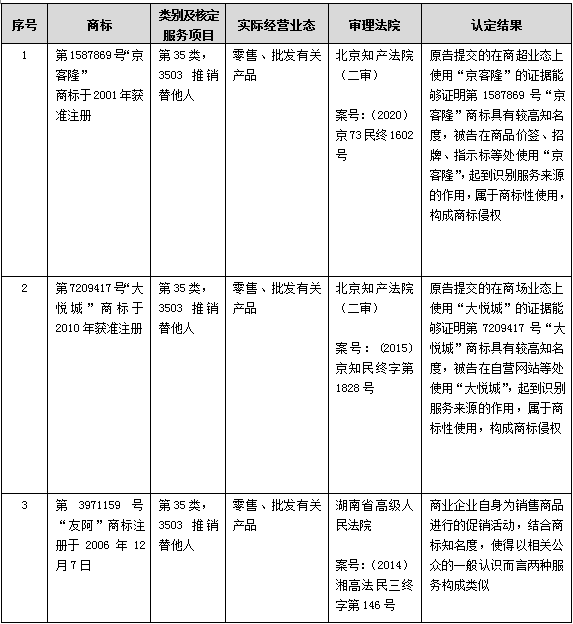 另外,即使在商標授權(quán)確權(quán)程序中,對一些案件的裁判結(jié)果與固有的“批發(fā)零售和推銷替他人不相同不類似”認知也相左,以下列舉“大潤發(fā)”、“無印良品”和“蘇寧”三個行政認定馳名商標案件為例予以說明?!按鬂櫚l(fā)”是知名的連鎖超市品牌,其權(quán)利人在2009年12月在第35類第3503類似群“推銷(替他人)”服務(wù)項目上注冊第5091186號“大潤發(fā)”商標,后在批發(fā)零售業(yè)態(tài)上進行了大量使用,2015年基于在批發(fā)零售上使用形成的知名度,第5091186號“大潤發(fā)”商標被認定為上海市著名商標,2016年該商標被原國家工商總局商評委認定為馳名商標。除此之外,類似情形的還有無印良品和蘇寧兩案。