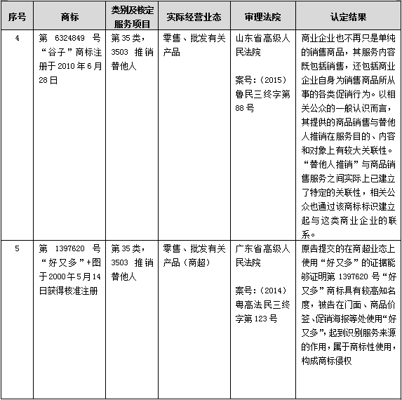 坦白地講,由于我國商標注冊主管機關(guān)并未準予在批發(fā)零售服務(wù)上注冊商標,因此司法機關(guān)當(dāng)然也不能越俎代庖。但根據(jù)“大悅城”、“好又多”、“京客隆”等商標侵權(quán)案件在司法實踐中確立的規(guī)則可知,在遵守目前區(qū)分表的既有規(guī)定以及尊重商標授權(quán)確權(quán)行政主管機關(guān)獨立行使審查權(quán)的情況下,可行的解決方案是,考慮到批發(fā)零售與推銷替他人之間客觀上存在密切的關(guān)聯(lián)關(guān)系,故,基于注冊商標禁用權(quán)保護的需要,將批發(fā)零售與推銷替他人認定為類似服務(wù),從而為那些在第35類推銷替他人服務(wù)上已注冊的知名度高、顯著性強的商標提供對等保護。以下是選取的基于“推銷替他人”保護批發(fā)零售及的案例: