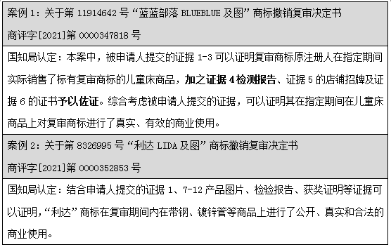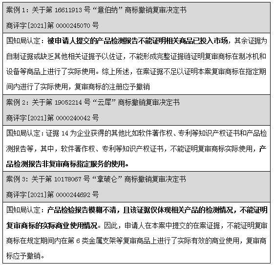 通過上述案例可見,不論是國(guó)知局還是法院階段,均有大量的裁定及判決直接認(rèn)定:產(chǎn)品檢測(cè)報(bào)告僅為產(chǎn)品檢測(cè)情況,無法證明商品進(jìn)入市場(chǎng)流通流域,不應(yīng)認(rèn)定為商標(biāo)法意義上的使用證據(jù)。但是針對(duì)該問題并沒有統(tǒng)一的裁判標(biāo)準(zhǔn),司法實(shí)踐中,也不乏案件綜合考量了產(chǎn)品檢測(cè)報(bào)告。部分案例列舉如下: