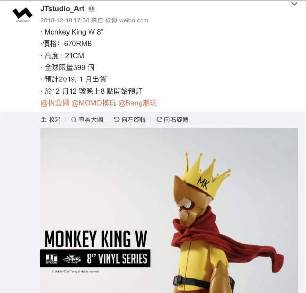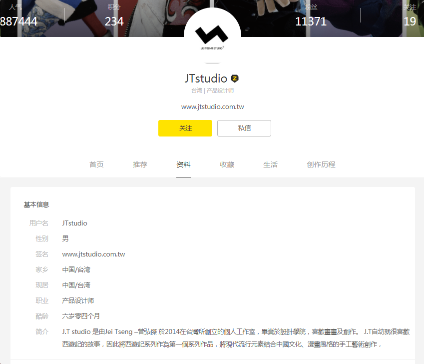 異議人站酷ZCOOL網(wǎng)站的個(gè)人主頁(https://www.zcool.com.cn/u/2732656/profile#tab_anchor)顯示,J.T studio是由異議人曾弘杰(英文名Jei Tseng)2014年在中國臺灣所創(chuàng)立的個(gè)人工作室,曾弘杰畢業(yè)于設(shè)計(jì)學(xué)院,喜歡畫畫及創(chuàng)作,自幼就很喜歡西游記的故事,因此將西游記系列作為第一個(gè)系列作品,將現(xiàn)代流行元素結(jié)合中國文化、漫畫風(fēng)格的手工藝術(shù)創(chuàng)作。異議人在站酷ZCOOL網(wǎng)站擁有11371位粉絲,人氣值高達(dá)1887444。