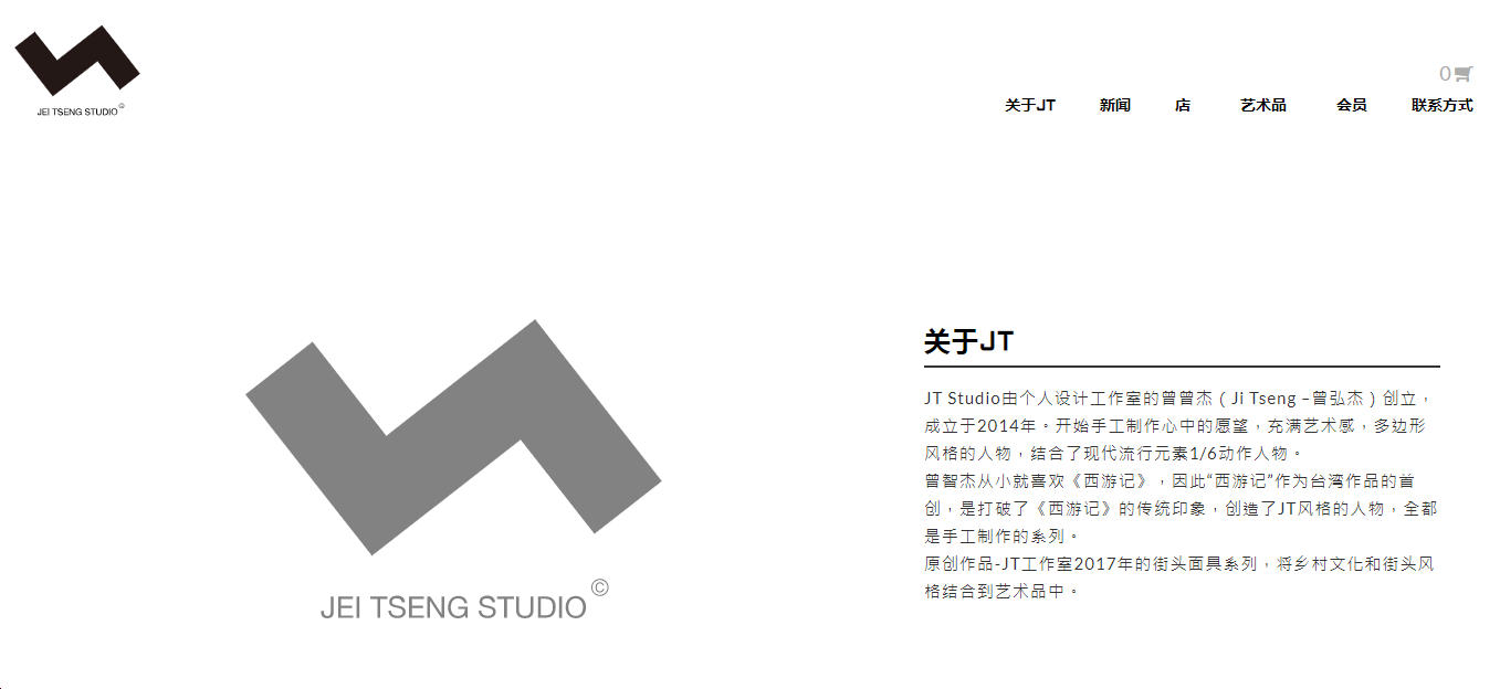 站酷ZCOOL網(wǎng)站中作者主頁顯示個(gè)人工作室官方網(wǎng)站為www.jtstudio.com.tw,異議人隨案提供了異議人個(gè)人工作室官網(wǎng)打印件,官網(wǎng)首頁顯示如下信息:JT Studio由個(gè)人設(shè)計(jì)工作室的曾弘杰(Jei Tseng 曾弘杰)創(chuàng)立,成立于2014年。開始手工制作心中的愿望,充滿藝術(shù)感,多邊形風(fēng)格的人物,結(jié)合了現(xiàn)代流行元素1/6動作人物。曾弘杰從小就喜歡《西游記》,因此“西游記”作為臺灣作品的首創(chuàng),是打破了《西游記》的傳統(tǒng)印象,創(chuàng)造了JT風(fēng)格的人物,全都是手工制作的系列。原創(chuàng)作品-JT工作室2017年的街頭面具系列,將鄉(xiāng)村文化和街頭風(fēng)格結(jié)合到藝術(shù)品中。