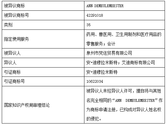 國(guó)家知識(shí)產(chǎn)權(quán)局經(jīng)審理本案認(rèn)為:被異議商標(biāo)“ANN DEMEULEMEESTER”指定使用于第35類(lèi)“藥用、獸醫(yī)用、衛(wèi)生用制劑和醫(yī)療用品的零售服務(wù);會(huì)計(jì)”等服務(wù)上。異議人引證在先注冊(cè)的第10622034號(hào)“安?迪穆拉米斯特”等系列商標(biāo)核定使用于第35類(lèi)“商業(yè)場(chǎng)所搬遷;文秘;會(huì)計(jì)”等服務(wù)上。雖然雙方商標(biāo)指定使用的部分服務(wù)相近,屬于類(lèi)似服務(wù),但雙方商標(biāo)文字構(gòu)成及整體外觀(guān)具有一定區(qū)別,未構(gòu)成近似商標(biāo),因此雙方商標(biāo)未構(gòu)成使用于類(lèi)似服務(wù)上的近似商標(biāo)。本案中,異議人稱(chēng)被異議人侵犯其姓名權(quán)并提供了如下證據(jù):異議人ANN DEMEULEMEESTER為世界知名時(shí)尚設(shè)計(jì)師,曾多次參加米蘭時(shí)裝周、巴黎時(shí)裝周等時(shí)尚頂級(jí)活動(dòng),同時(shí)異議人創(chuàng)辦的同名品牌“ANN DEMEULEMEESTER”在倫敦、巴黎、東京、香港、上海等地均有其專(zhuān)賣(mài)店,并在相關(guān)公眾中獲得了一定的影響力。上述證據(jù)可證明:異議人ANN DEMEULEMEESTER在時(shí)尚行業(yè)內(nèi)已具有一定知名度,為相關(guān)公眾所知曉。此外,ANN DEMEULEMEESTER獨(dú)創(chuàng)性極高,并非常見(jiàn)的外國(guó)姓名,且被異議商標(biāo)“ANN DEMEULEMEESTER”是普通字體的純英文商標(biāo),與異議人姓名在字母組成及呼叫上完全相同。被異議人未經(jīng)異議人許可,擅自將與其姓名完全相同的“ANN DEMEULEMEESTER”作為商標(biāo)申請(qǐng)注冊(cè),已構(gòu)成對(duì)異議人姓名權(quán)的侵犯。