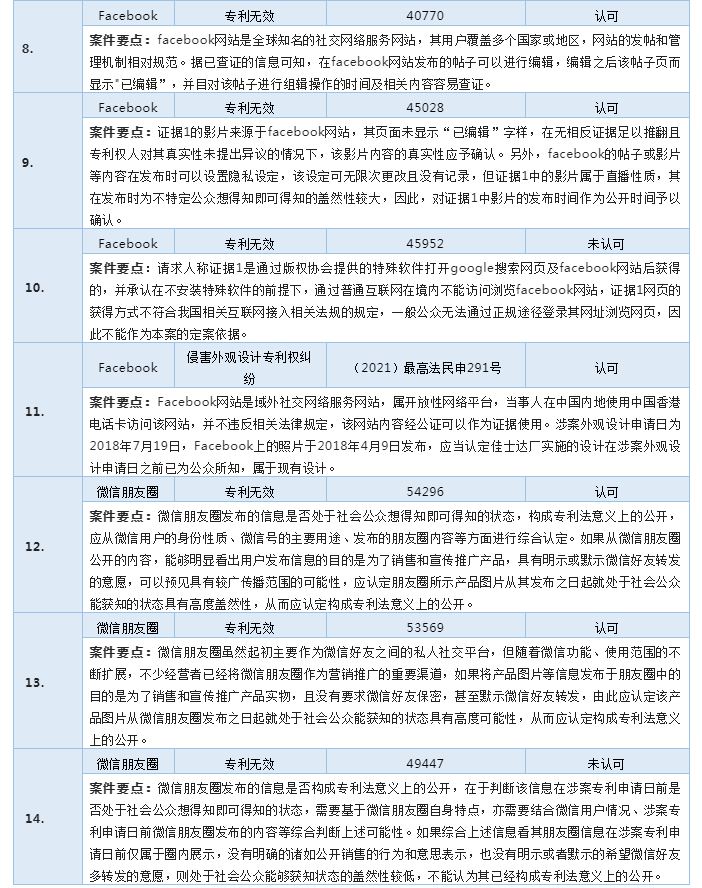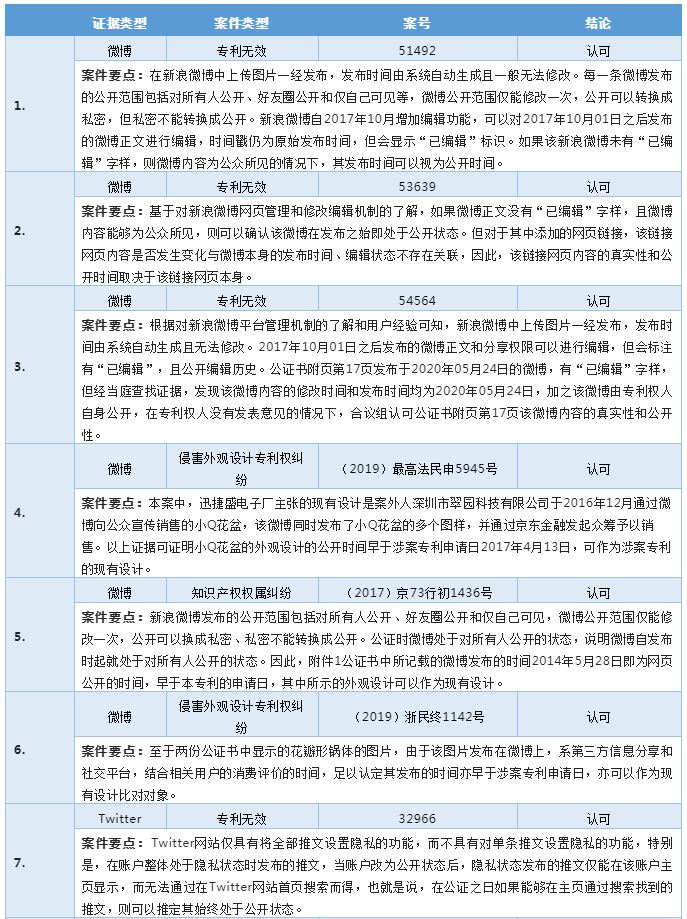 社交網(wǎng)絡類平臺及相關軟件應用因其用戶交互模式的易用性及便捷性擁有數(shù)量極為龐大的用戶,由此產(chǎn)生的海量信息中往往蘊含可用作認定為現(xiàn)有技術的證據(jù)。常見的社交網(wǎng)絡平臺包括新浪微博、微信公眾平臺、微信朋友圈、Facebook、Twitter等,而不同類型的社交平臺其隱私功能,已發(fā)布信息修改功能均有所不同。比如新浪微博用戶在發(fā)表微博時,存在私密權限和公開權限的設置,微博公開范圍可以從公開轉成私密,但私密不能轉成公開。而微信朋友圈的公開范圍可以在公開與私密間來回切換且不會影響發(fā)布時間,也不會留下編輯痕跡。因此,在實踐中認定此類社交網(wǎng)絡類證據(jù)是否構成專利法意義上的公開時,主要的考量的重點為公開性及公開時間。下表是認定社交網(wǎng)絡平臺類網(wǎng)絡證據(jù)的案例梳理。