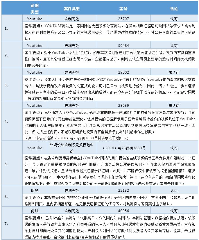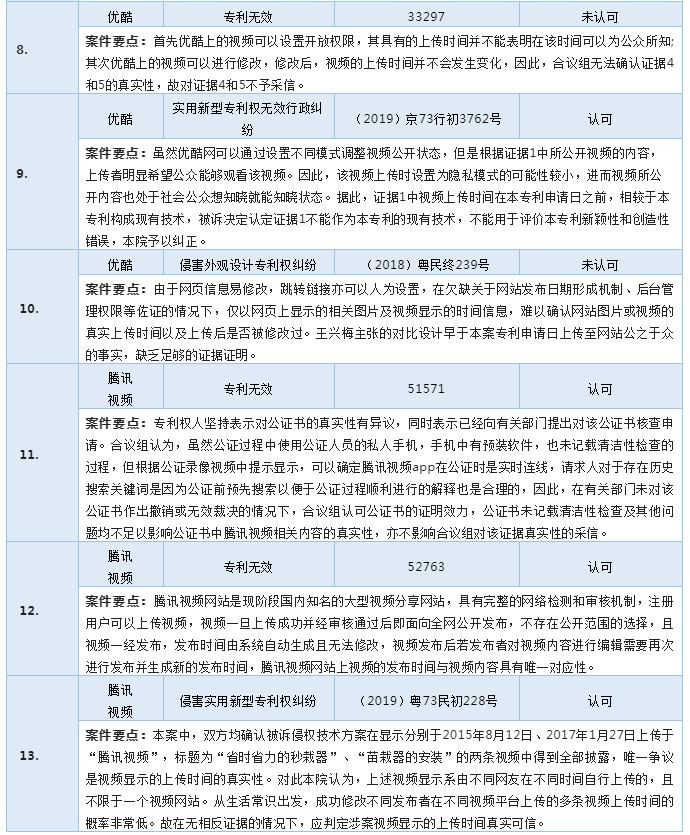 相較于社交平臺類網(wǎng)絡證據(jù),視頻流媒體類網(wǎng)絡證據(jù)因其獨特的形式往往蘊含更為豐富的有效信息,并且能夠讓人更為直觀的理解目標信息。對于視頻流媒體類網(wǎng)絡證據(jù)的認定規(guī)則與社交平臺類網(wǎng)絡證據(jù)較為相似,考量的重點不外乎真實性,公開性以及公開時間,但因視頻流媒體平臺的相關隱私權限規(guī)則及修改規(guī)則較為隱蔽,需要針對平臺規(guī)則進行詳細解釋說明。同時應當注意的是,在實踐中由于部分企業(yè)存在產(chǎn)品宣傳先行,專利申請滯后的情況,相關視頻的發(fā)布者往往是專利權人或其關聯(lián)主體。在此種情形下,應當著重審核發(fā)布主體的身份用以輔助參考證據(jù)的真實性及公開性。下表是認定視頻流媒體類網(wǎng)絡證據(jù)的案例梳理。
