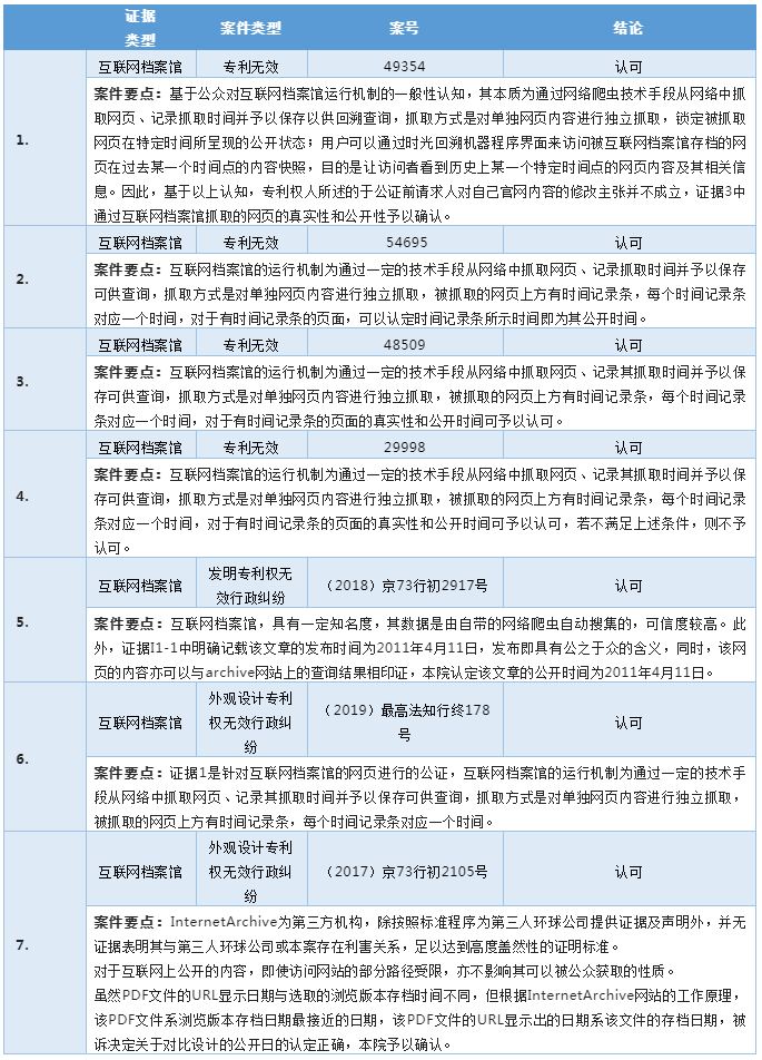 互聯(lián)網(wǎng)檔案館(Internet Archive)是一家以普及利用所有知識為目標的非營利性數(shù)字圖書館?;ヂ?lián)網(wǎng)檔案館提供永久存儲和免費的公共訪問的數(shù)字化材料信息集合,讓公眾上傳和下載數(shù)字材料到其數(shù)據(jù)集群,但其大部分數(shù)據(jù)是靠其網(wǎng)絡爬蟲自動收集?;ヂ?lián)網(wǎng)檔案館的Web歸檔文件系統(tǒng)Wayback機器包含了超過1500億以上的網(wǎng)頁存檔。有別于其他類型的網(wǎng)絡證據(jù),互聯(lián)網(wǎng)檔案館較為特殊,其本質上屬于可溯源的歷史上曾存在的網(wǎng)頁資源記錄,在抓取網(wǎng)頁信息時即可證明該網(wǎng)頁相關信息處于公開狀態(tài),并且互聯(lián)網(wǎng)檔案館會記錄抓取信息的時間。下表是認定互聯(lián)網(wǎng)檔案館網(wǎng)絡證據(jù)的案例梳理。