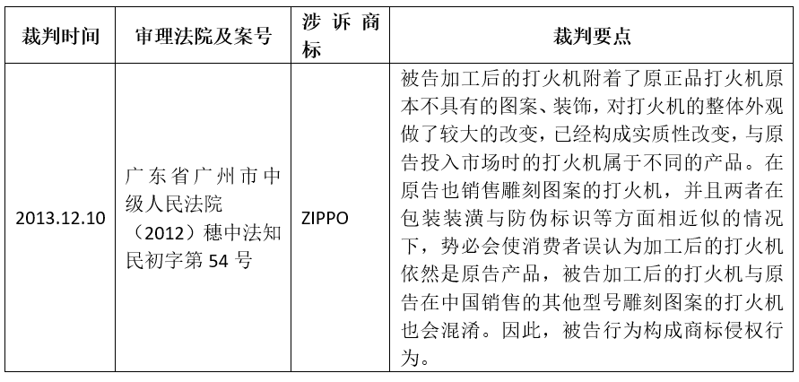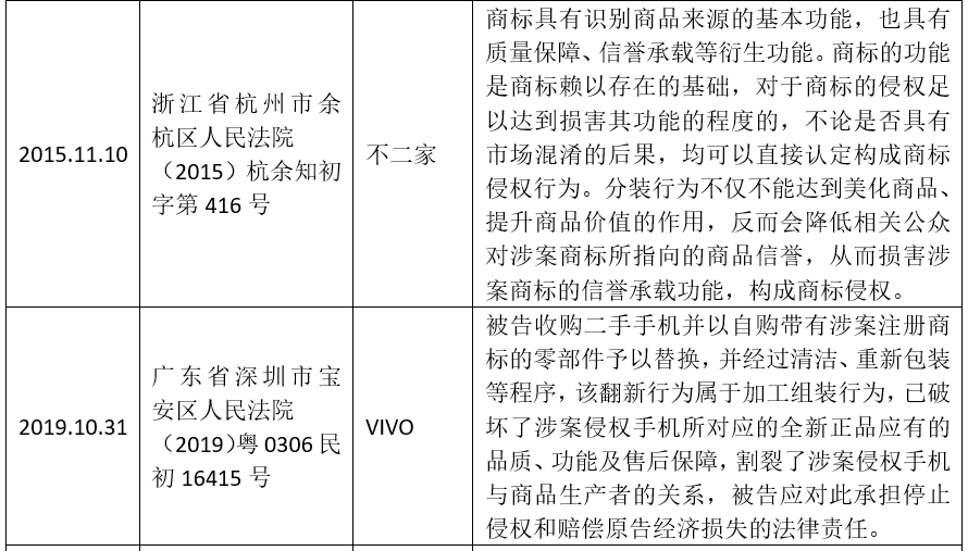 在最高人民法院就上述案件再審作出裁定前,已存在多份判決將此類行為認定為構(gòu)成商標(biāo)侵權(quán)的案例,部分還入選當(dāng)?shù)胤ㄔ旱哪甓仁笾R產(chǎn)權(quán)保護案件。如,廣東省廣州市中級人民法院審結(jié)的“ZIPPO打火機”案【(2012)穗中法知民初字第54號】;浙江省杭州市余杭區(qū)人民法院審結(jié)的“不二家糖果”案【(2015)杭余知初字第416號】,該案入選“2015年浙江法院十大知識產(chǎn)權(quán)保護案件”;廣東省深圳市寶安區(qū)人民法院審結(jié)的“VIVO手機”案【(2019)粵0306民初16415號】;江蘇省蘇州市中級人民法院審結(jié)的“美的洗衣機”案【(2018)蘇05民初1020號】等。以下通過列表的形式展示相關(guān)參考信息: