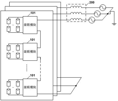 1、一種中高壓光伏發(fā)電系統(tǒng),其特征在于,包括三相濾波器和三個(gè)分別通過所述三相濾波器以星形或三角形接法實(shí)現(xiàn)連接的相電路,所述相電路中包括一個(gè)或者兩個(gè)串聯(lián)的橋臂,所述橋臂包括:至少一個(gè)級聯(lián)模塊、至少一個(gè)光伏組串和至少一個(gè)絕緣子,所述光伏組串包括多個(gè)光伏組件;所述橋臂中: