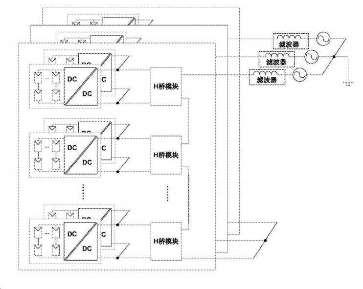 例如,在下述一件美國專利申請中,提供一種中高壓光伏發(fā)電系統(tǒng),其光伏組串采用中高壓絕緣耐壓等級的絕緣子實(shí)現(xiàn)與大地之間的隔離,使光伏組串能夠串聯(lián)到更高電壓等級,接入各自對應(yīng)的級聯(lián)模塊之后,各個(gè)級聯(lián)模塊的串聯(lián)輸出能夠通過三相濾波器并入10kV等級電網(wǎng),而不再需要常規(guī)電站中的電力升壓變壓器或者高頻隔離型DC/DC變換器,相比常規(guī)系統(tǒng)方案提升了系統(tǒng)效率。其對應(yīng)附圖如下: