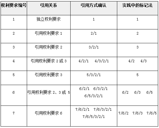 在上表中給出的權(quán)利要求引用關(guān)系中,在判斷時每個權(quán)利要求的每個方案都必須單獨被對待。對于其中存在的多項引用權(quán)利要求(上表中的權(quán)利要求4、6和7),當其接到拒絕理由、限制要求或?qū)彶閱T的其他要求或意見時,可僅針對單個權(quán)利要求提出。例如,對于權(quán)利要求4引用權(quán)利要求2的方案、權(quán)利要求4引用權(quán)利要求3的方案,當遇到反對理由時,可僅在反對理由中針對權(quán)利要求4提出。