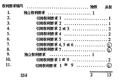 在上面例子中,權(quán)利要求1和9是獨立權(quán)利要求,權(quán)利要求2-3和5-6各自是從屬權(quán)利要求,權(quán)利要求4引用權(quán)利要求2或3,在費用上計算為兩項權(quán)利要求;權(quán)利要求5-6均直接或間接引用權(quán)利要求4,在費用上也各自計算為兩項權(quán)利要求;權(quán)利要求7和8涉及“多項引用多項”,屬于不符合要求的多項引用權(quán)利要求(即前述所謂的“不適合的多項引用權(quán)利要求”),因此會被標記為“①”;權(quán)利要求10引用了獨立權(quán)利要求1或9,因此在費用上按兩項權(quán)利要求計算;權(quán)利要求11被標記為“①”是因為其非擇一引用的方式(引用“權(quán)利要求1和9”,而不是“1或9”)。