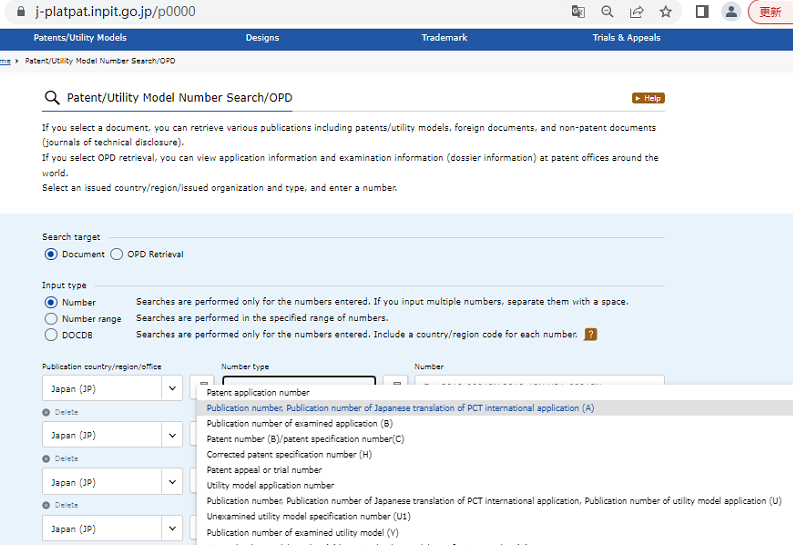 Patent/Utility Model Number Search/OPD:可以檢索各種公開(kāi)物(包括發(fā)明/實(shí)用新型)或世界各國(guó)專利的申請(qǐng)狀態(tài)和審查狀態(tài)(dossier information)。