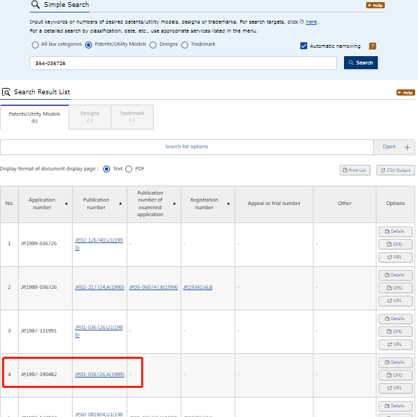 Simple Search能夠檢索出與號(hào)碼S64-036726相關(guān)的所有專利。由“特開(kāi)”可知該號(hào)碼為發(fā)明公開(kāi)號(hào),因此結(jié)尾專利類型應(yīng)為“A”,可在Search Result List里找到正確的結(jié)果應(yīng)為JP,01-036726,A(1989)。