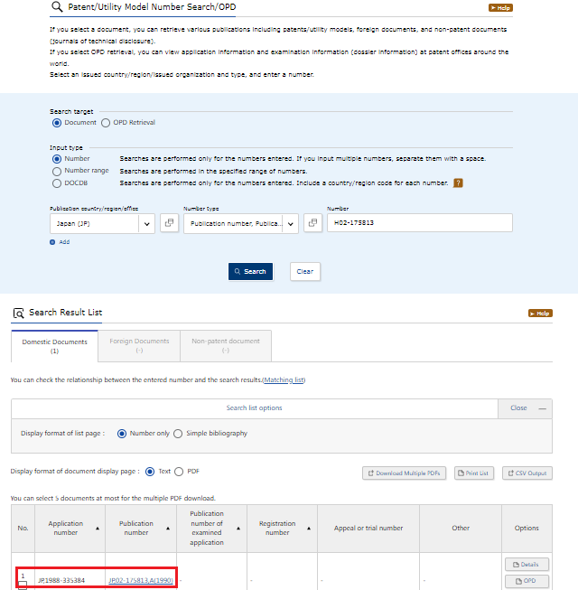 Patent/Utility Model Number Search/OPD能檢索出唯一的結(jié)果JP,01-036726,A(1989)。