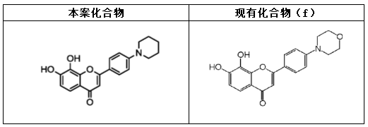 案例1:該案涉及作為TrkB激動劑的二羥基黃酮類化合物,該案最主要的化合物和最接近的現(xiàn)有化合物的結(jié)構(gòu)式如下,兩者具有相同的母核苯基二羥基黃酮、用途類似,區(qū)別僅在于本案的苯基上的取代基為哌啶基而現(xiàn)有化合物f為嗎啉基。
