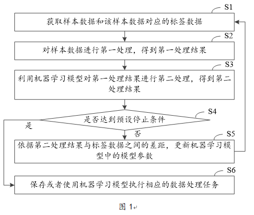 步驟4,判斷是否達(dá)到預(yù)設(shè)停止條件,若否,則依據(jù)所述第二處理結(jié)果和所述標(biāo)簽數(shù)據(jù)之間的差距,更新機(jī)器學(xué)習(xí)模型中的模型參數(shù),并繼續(xù)執(zhí)行所述步驟1至所述步驟4;若是,則保存或者使用所述機(jī)器學(xué)習(xí)模型執(zhí)行相應(yīng)的數(shù)據(jù)處理任務(wù)。