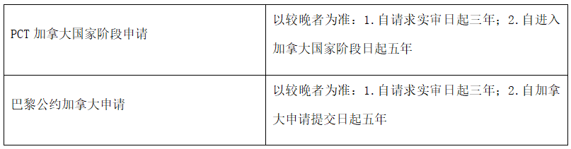實(shí)審必須在加拿大申請(qǐng)日后四年內(nèi)請(qǐng)求并支付審查費(fèi)。因此,對(duì)于PCT國(guó)家階段申請(qǐng),如果該P(yáng)CT申請(qǐng)要求了優(yōu)先權(quán),審查請(qǐng)求可以推遲到進(jìn)入加拿大國(guó)家階段后30個(gè)月內(nèi)提出。分案申請(qǐng)的規(guī)則有所不同,分案申請(qǐng)可以在母案授權(quán)前一天提交,并且可以提交“多代”分案申請(qǐng)。分案申請(qǐng)的審查請(qǐng)求和費(fèi)用須在最早母案申請(qǐng)日起四年或分案申請(qǐng)“提交日”后三個(gè)月內(nèi)(以較晚者為準(zhǔn))提交。