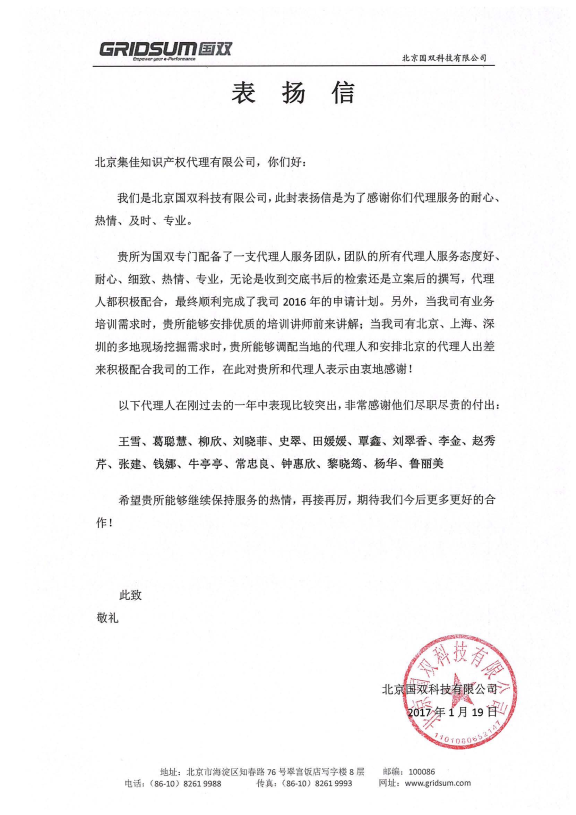 本次發(fā)來表揚(yáng)信的是北京國雙科技有限公司,信中,客戶對楊五、王寶筠等專業(yè)人員的辛勤付出表示感謝,對集佳專業(yè)高效的服務(wù)、一絲不茍的工作態(tài)度表示認(rèn)可。