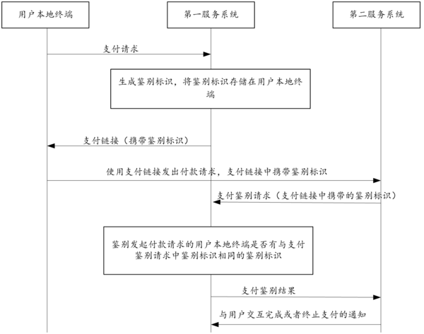 所述第一服務(wù)系統(tǒng)接收第二服務(wù)系統(tǒng)發(fā)送的支付鑒別請求,所述支付鑒別請求中攜帶有所述第二服務(wù)系統(tǒng)從用戶向其發(fā)起付款請求時所使用的支付鏈接中獲取的鑒別標(biāo)識;