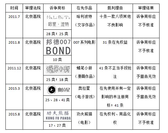 對于這種權(quán)利沖突類型,最初因缺少明確的法律規(guī)制,對在先作品名稱不予保護(hù)的情況并不少見;但隨著遏制惡意搶注的加強(qiáng),商標(biāo)禁注的“絕對條款”開始被適用,比如援引“其他不良影響”條款不予注冊的“哈里波特”,再比如援引“不正當(dāng)手段搶注”條款不予注冊的“蠟筆小新”。但用“絕對條款”保護(hù)相對權(quán)利畢竟有些名不正言不順,北京高院藉由“邦德007”、“功夫熊貓”兩案,首次將在先影視作品名稱、角色名稱作為在先權(quán)益進(jìn)行保護(hù),引導(dǎo)適用“相對條款”而不是“絕對條款”來解決這種沖突。在此期間,也有類似“奧拉星”的案件,適用“在先使用并有一定影響的未注冊商標(biāo)”條款來保護(hù)在先游戲名稱。本文附表一總結(jié)了近年來北京法院在商標(biāo)授權(quán)確權(quán)類案件中保護(hù)在先各類作品名稱的情況,供讀者參考。