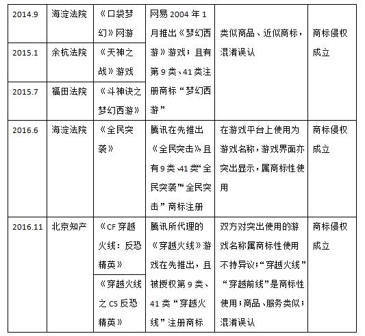 筆者也注意到,在一系列涉及游戲的商標(biāo)侵權(quán)案件中,法院大多認(rèn)定侵權(quán)成立。但這些案件也存在一個共性,即在先商標(biāo)權(quán)人同時也是在先游戲的開發(fā)者或運(yùn)營者。即便不考慮在先注冊商標(biāo),在先游戲也可以通過主張知名商品特有名稱的反法仿冒條款獲得救濟(jì)。本文附表三總結(jié)了原告具有在先作品權(quán)利人和在先商標(biāo)注冊人雙重身份的案例。