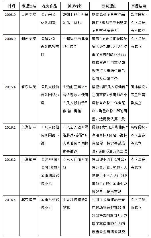 這種類型的案件目前數(shù)量不多,但可以預(yù)見,將文化轉(zhuǎn)化為商業(yè)力量已經(jīng)是文化傳媒產(chǎn)業(yè)的大趨勢,隨之而來的類似案件將會急劇增加。從已決的案件結(jié)果看,對于在先作品名稱的商業(yè)化利用問題,司法判決已經(jīng)從不保護(hù)逐漸轉(zhuǎn)向保護(hù);在法律適用方面,較多的案例引用反不正當(dāng)競爭法第二條的一般條款進(jìn)行判決,也存在個案適用反不正當(dāng)競爭法第五條第二項(xiàng)。筆者認(rèn)為,將他人在先作品名稱作為自身商品或服務(wù)的標(biāo)識使用,確實(shí)可能會使人誤認(rèn)為該商品或服務(wù)與作品權(quán)利人之間存在授權(quán)許可、合作等特定關(guān)系,但這種認(rèn)知不同于商品或服務(wù)來源的混淆,與反法仿冒意義上的混淆、誤認(rèn)還是存在明顯區(qū)別。何況,反法第五條的保護(hù)范圍通常是在類似商品或服務(wù)的范圍之內(nèi),將這一條款擴(kuò)大適用到作品的衍生商品或服務(wù)范圍,稍顯牽強(qiáng)。因此,在反法第五條修改之前,適用第二條一般性條款似乎更為適當(dāng)。本文附表五總結(jié)了此類案件的審理情況,供讀者參考。