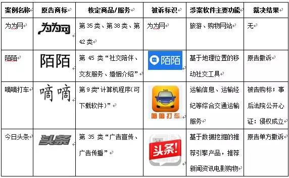 2014年8月上海市第一中級人民法院受理的上海易飾嘉網(wǎng)絡(luò)科技有限公司起訴上海沃商信息科技有限公司推出、蘋果APP Store分發(fā)的“為為網(wǎng)”APP侵害其第35類、38類、42類服務(wù)上注冊的“為為網(wǎng)”商標,索賠人民幣1億元,被業(yè)內(nèi)稱為首例(實際上,立案時間晚于杭州中院“嘀嘀打車”一案)移動互聯(lián)網(wǎng)商標侵權(quán)糾紛,由于雙方和解或其他原因,該案并未有判決做出。同樣,2014-2015年間,杭州陌陌婚慶服務(wù)有限公司以其在45類“社交陪伴、交友服務(wù)、婚姻介紹”等服務(wù)上注冊的“陌陌”商標,先后向北京市朝陽區(qū)人民法院、北京知識產(chǎn)權(quán)法院起訴北京陌陌科技有限公司停止“陌陌”軟件的下載服務(wù)并索賠1100萬元,后兩案均以原告撤訴結(jié)案。2014年5月,杭州妙影微電子有限公司、寧波市科技園區(qū)妙影電子有限公司訴北京小桔科技有限公司“嘀嘀打車”侵犯其第9類“計算機程序(可下載軟件)”上注冊的“嘀嘀”商標,索賠經(jīng)濟損失人民幣8000萬,2015年5月杭州市中級人民法院開庭審理了此案,2016年5月原告以適當價格(據(jù)傳為人民幣300萬元)將其注冊商標一并轉(zhuǎn)讓給被告后,原告撤訴。2016年6月北京博天恒業(yè)廣告有限公司向北京市西城區(qū)人民法院起訴稱,北京字節(jié)跳動科技有限公司、北京字節(jié)跳動網(wǎng)絡(luò)技術(shù)有限公司手機端“今日頭條”APP的名稱、圖標以及PC端“頭條網(wǎng)站”侵犯其在第35類“廣告宣傳、廣告?zhèn)鞑ァ鄙虾藴首缘摹邦^條”商標,要求停止侵權(quán)、消除影響,并索賠高達人民幣1億元的經(jīng)濟損失,2016年11月,原告單方撤訴[2]。目前,涉及APP的商標侵權(quán)糾紛案件,可資借鑒的判例主要有2014年1月東莞市中級人民法院審理的“115網(wǎng)盤”一案[3],2015年2月北京市海淀區(qū)人民法院審理的“滴滴打車”一案[4],2015年12月北京知識產(chǎn)權(quán)法院審理的“西柚”一案[5],2016年8月北京市海淀區(qū)人民法院審理的“楚楚街”一案[6],2016年9月北京市高級人民法院再審結(jié)案的“新浪拍客”一案[7],2017年4月杭州濱江區(qū)法院一審的“曹操專車”一案;而杭州中院雖未就“嘀嘀打車”一案做出判決,但主審法官在其文章中[8]公開了該案的審理思路,同樣具有重要的參考價值。