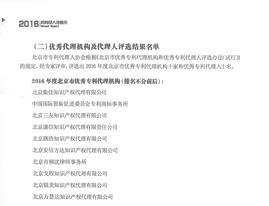 《2016年度北京市專利代理年報》數(shù)據(jù)來源于國家知識產(chǎn)權局公開的機構情況、國家知識產(chǎn)權局條約法規(guī)司編制的《專利代理簡訊》、專利代理機構報送的年檢數(shù)據(jù)以及北京市專利申請及授權數(shù)據(jù)。年報從北京市專利代理機構整體情況、業(yè)務經(jīng)營情況、專利代理人培訓、資格考試情況等方面展示了北京專利代理行業(yè)的整體面貌和發(fā)展動態(tài)。