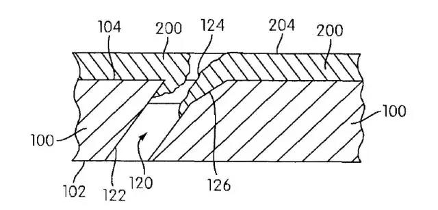 對比文件1教導(dǎo)的是一種再次敞開計(jì)量孔的方法,其用于舊構(gòu)件的翻新或再處理。也就是說,冷卻孔120的翼狀槽126(擴(kuò)寬部)在施加熱障涂層200之前就已經(jīng)存在于原有制品100中。這類似于本申請圖2中所示的現(xiàn)有技術(shù)。