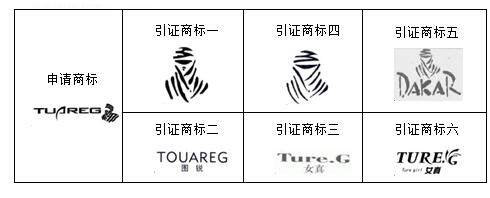 經(jīng)評(píng)審認(rèn)為,申請(qǐng)商標(biāo)與商標(biāo)局駁回時(shí)所引證的第5110766號(hào)圖形商標(biāo)(以下稱(chēng)引證商標(biāo)一)、第4100562號(hào)“圖銳TOUAREG”商標(biāo)(以下稱(chēng)引證商標(biāo)二)、第1741769號(hào)“女真Ture.G”商標(biāo)(以下稱(chēng)引證商標(biāo)三)、第3882012號(hào)圖形商標(biāo)(以下稱(chēng)引證商標(biāo)四)、國(guó)際注冊(cè)第606861號(hào)“DAKAR及圖”商標(biāo)(以下稱(chēng)引證商標(biāo)五)、第9487138號(hào)“女真TURE.G Ture gir1及圖” 商標(biāo)(以下稱(chēng)引證商標(biāo)六)在文字構(gòu)成、呼叫上存在一定差異,未構(gòu)成使用在同一種或類(lèi)似商品上的近似商標(biāo)。依照《中華人民共和國(guó)商標(biāo)法》第二十八條的規(guī)定,最終決定:申請(qǐng)商標(biāo)的注冊(cè)申請(qǐng)予以初步審定。