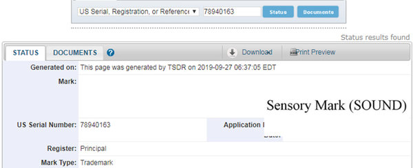聲音商標(biāo)在官網(wǎng)的頁面上顯示為SENSORY MARK (SOUND),其在申請文件頁面的Mark部分為一段音軌,具體如下: